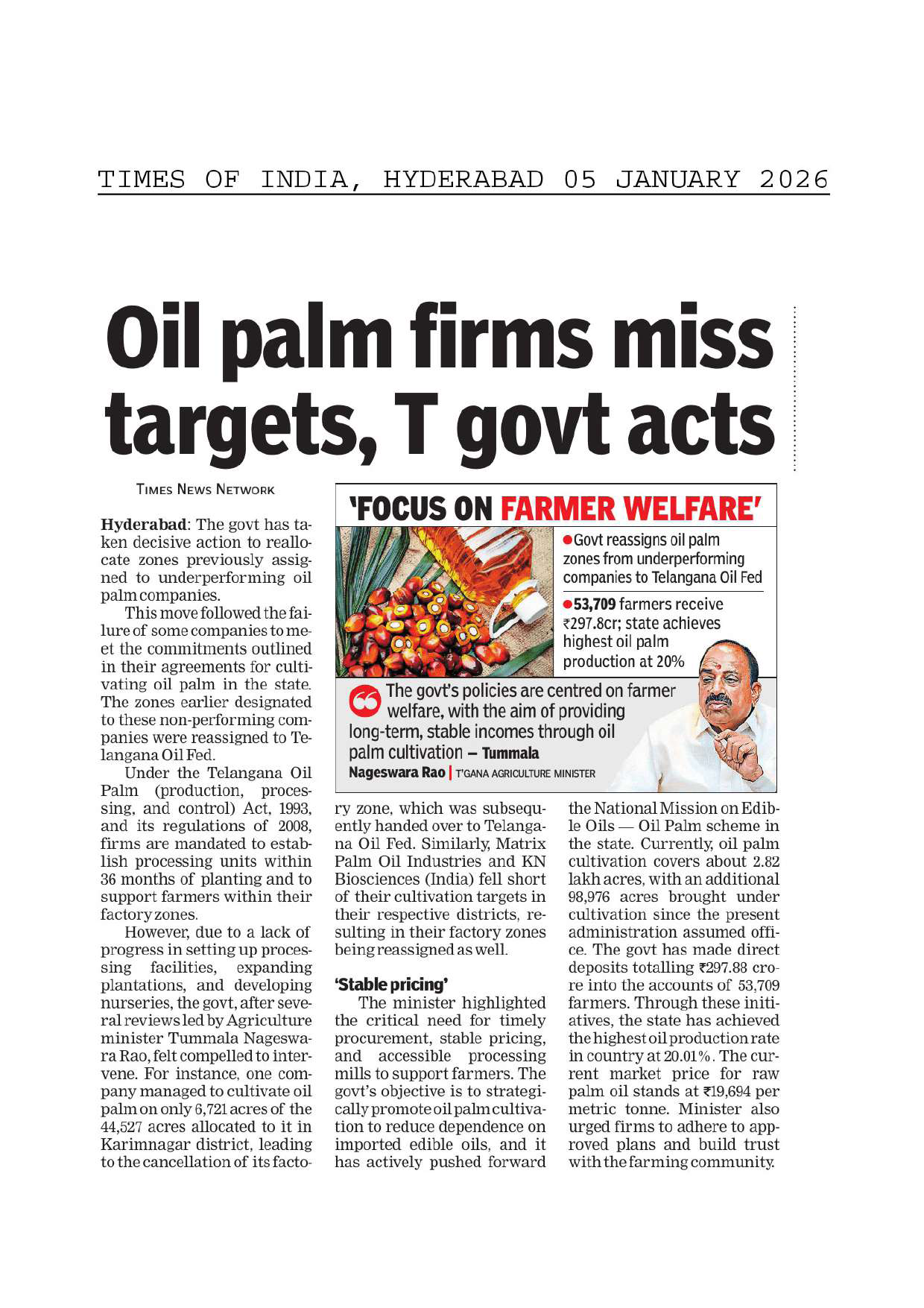 Oil palm firms miss targets, T govt acts: Times of India, Hyderabad, 5th Jan 2026